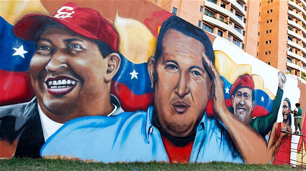 یک نقاش ونزوئلایی در حال کشیدن نقاشی دیواری از هوگو چاوز در کاراکاس