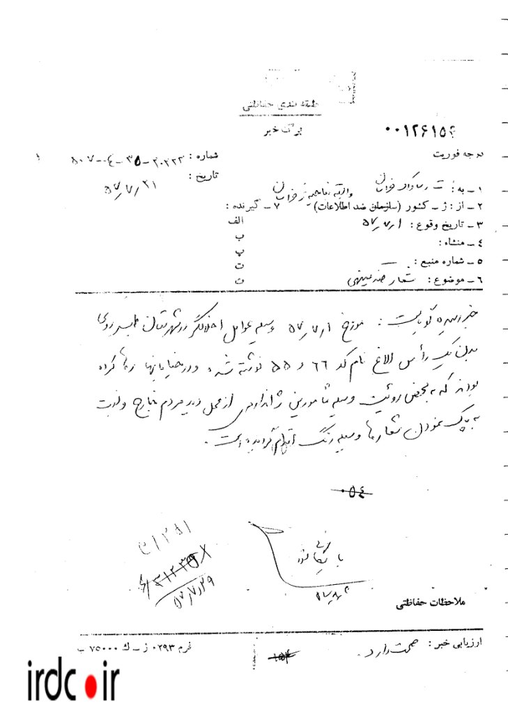 مرکز اسناد انقلاب اسلامی به نقل از یک سند ساواک نوشت: خبر رسیده گویاست: مورخ 1/ 7 / 57 به وسیله عوامل اخلالگر در شهرستان طبس روی بدن یك راس الاغ نام كد 66 و 55 (کد مربوط به محمدرضا پهلوی و فرح دیبا در اسناد ساواک) نوشته شده و در خیابانها رها كرده بودند كه به محض رویت به وسیله مامورین ژاندارمری از محل دید مردم خارج و نسبت به پاك نمودن شعارها به وسیله رنگ اقدام گردیده است.