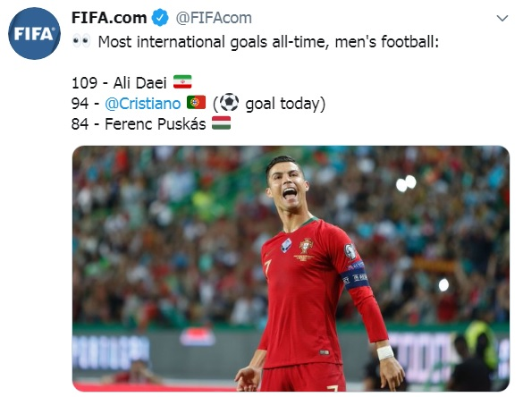 صفحه توییتری فیفا با درج این نکته عنوان کرد،‌رونالدو تا رکورد دایی که 109 گل است،15 گل فاصله دارد.رتبه سوم بهترین گلزنان تاریخ جهان فرنس پوشکاش با 84 گل است.